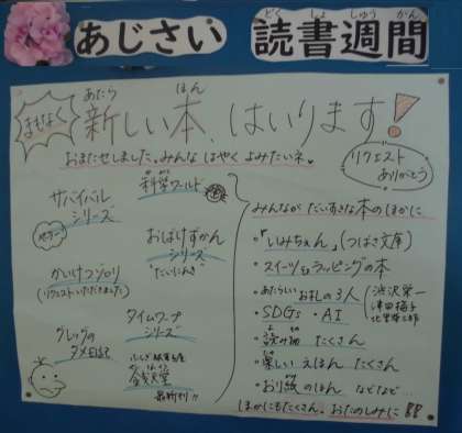 あじさい読書週間が始まって、1週間になりました。友達に紹介したい本のPOPをつくってみませんか?つくろうと思った人は、火・水・金の中間放課か昼放課に、図書室の先生(図書司書の先生)からキット(カード、カード立て、作り方ガイド)をもらってつくってください。6月18日(金)までに完成して提出してください。