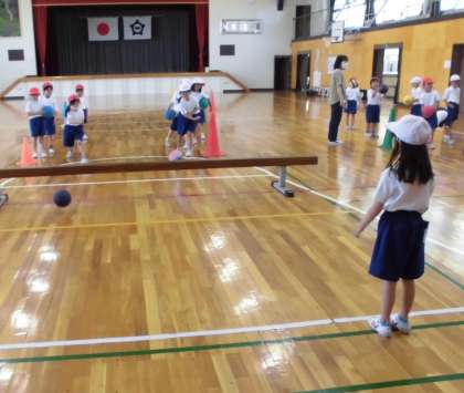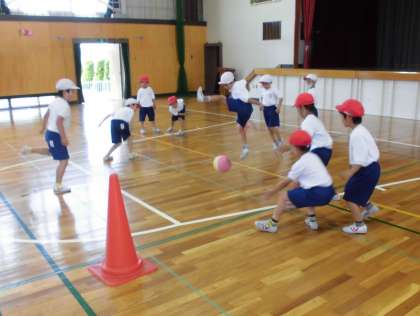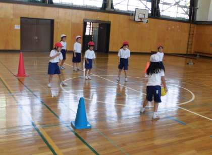 体育の授業【6月9日(水)の1年生】 公開日 2021/06/09 更新日 2021/06/09 1年 屋内運動場での体育は、「ボール投ゲーム」をしました。平均台の下をくぐらせたり、カラーコーンをめがけて的あてをしたりして転がす練習をし、最後は楽しく転がしドッジボールをしました。