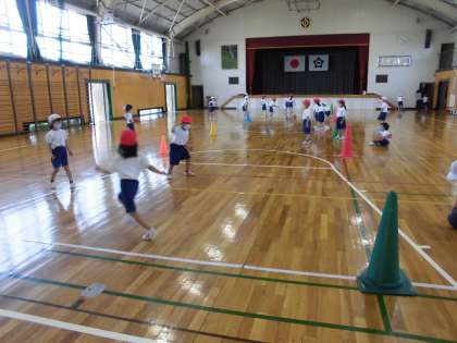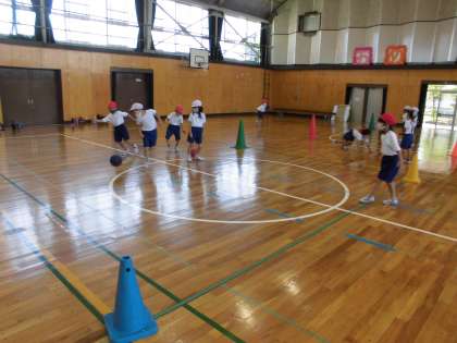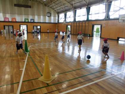 体育の授業 その2 【6月9日(水)の1年生】 公開日 2021/06/09 更新日 2021/06/09 1年 2対2で転がしドッジのゲームをしました。ボールをとったらすぐに転がしたり、相手をよく見て転がしたりしました。