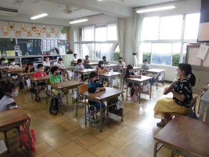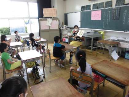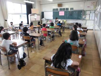 小学校に入ってはじめての読み聞かせがありました。ひなたぼっこさんの話を真剣に聞いていました。