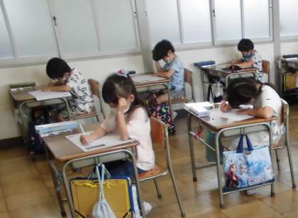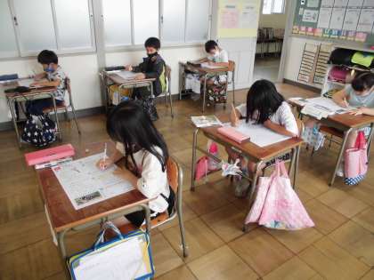 活動の様子【6月15日(火)の1年生】 公開日 2021/06/15 更新日 2021/06/15 1年 国語では、初めての読み取りテストがありました。問題の答え方のお話を聞いた後、文を読んで真剣に答えていました。
