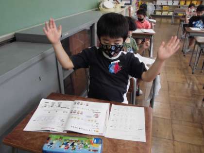 音楽の授業【6月16日(水)の1年生】 公開日 2021/06/16 更新日 2021/06/16 1年 「たん」と「うん」を組み合わせて、リズムを作りました。自分で作ったリズムで、曲に合わせて、楽しくリズム打ちをしました。