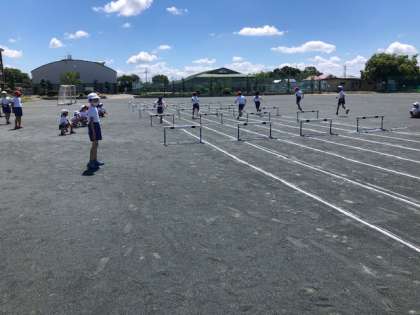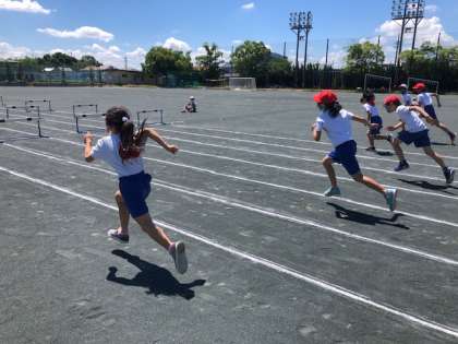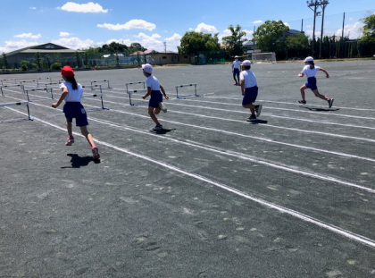 体育の授業の様子です。 ペアの子と、歩数やフォームを見合い、 アドバイスし合って練習しました。