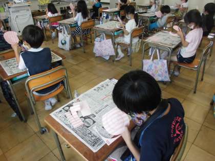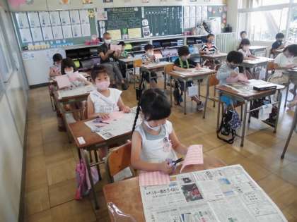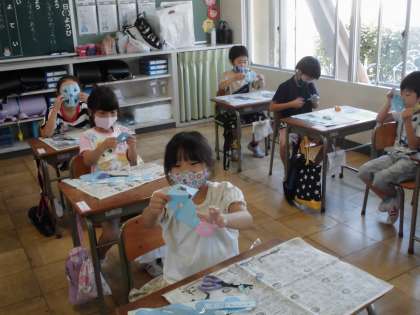 ハサミの使い方を確かめたあと、紙を折ったり、切ったりして飾りを作りました。