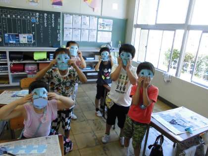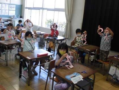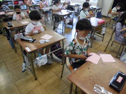 ちょきちょきかざり その2【6月17日(木)の1年生】 公開日 2021/06/18 更新日 2021/06/18 1年 切ってできた形から想像が膨らみ、思いついたことを友達と共有していました。 とても楽しそうでした。
