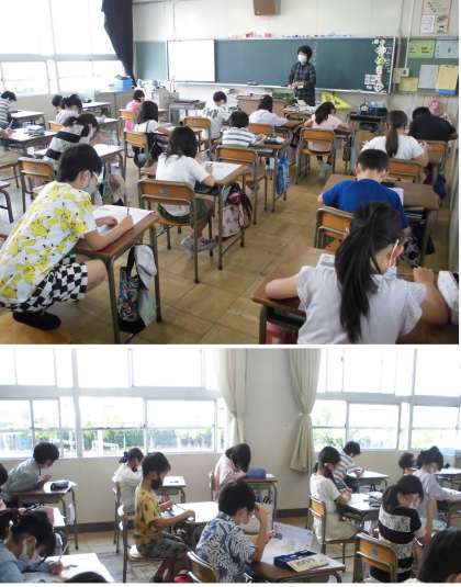 「一宮市の様子」のテストを行っています。どの子も真剣に問題に取り組んでいます。