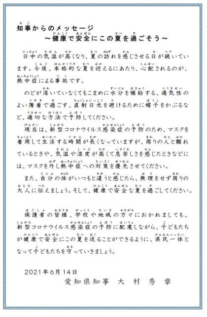 愛知県の大村知事さんより、「健康で安全にこの夏を過ごそう」という熱中症事故防止に向けたメッセージが届きました。今後、各家庭にプリントで配付します。