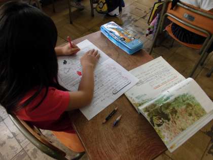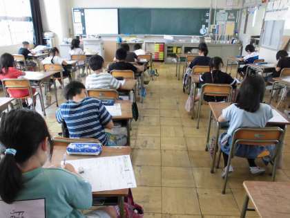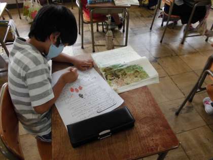 漢字検定の様子です。みんな真剣です。素晴らしい集中力でした。よく頑張りました。国語の授業では、スイミーや魚たちの気持ちを考えて、ワークシートの書きました。