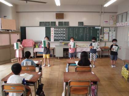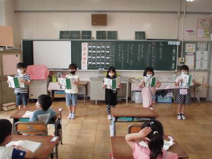 音読発表会をしました。大きな声ではきはき読むことと「うんとこしょ、どっこいしょ。」のところを工夫して読むことに気をつけました。