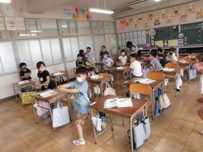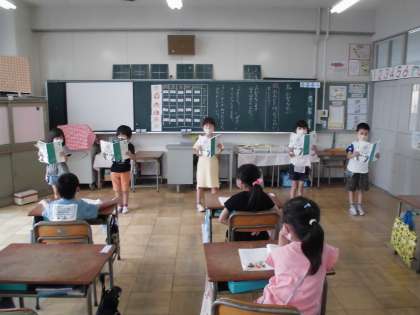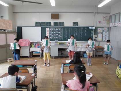 音読発表会 その2 【6月24日(木)の1年生】 公開日 2021/06/24 更新日 2021/06/24 1年 「とうとう、かぶがぬけました。」のあとに、一人ずつ登場人物の気持ちになって、思ったことを言いました。音読発表会後に、友達のよかったところを発表しました。最後に、みんなでかぶを引っ張る動作をしながら「うんとこしょ、どっこいしょ。」と、言いました。音読発表会が楽しかったと言っていました。