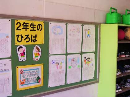 昇降口の掲示コーナーには夏休みの思い出が掲示してあります。どの子も楽しい思い出を上手に書いています。3年生は「写生大会巡回展」の作品を鑑賞しています。思ったこと、感じたことを文章にまとめていました。足洗い場の側溝のふたを修理してもらいました。運動会の練習で手足を洗うことが多くなります。けがの無いようにきれいに修理してもらいました。