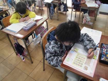 活動の様子【12月14日(水)の1年生】 公開日 2021/12/14 更新日 2021/12/14 1年 音楽の時間、「すずめがちゅん」の曲に合わせて鍵盤ハーモニカで演奏、歌唱、ドレミ体操をしました。算数の時間は、元の位置を決めて、もののいちがどこにあるかを考えました。
