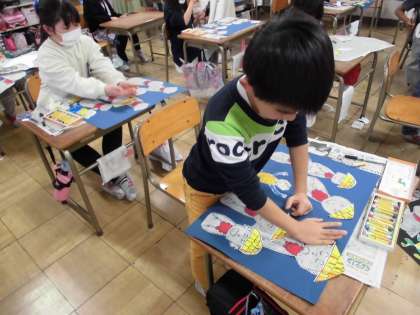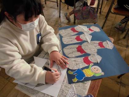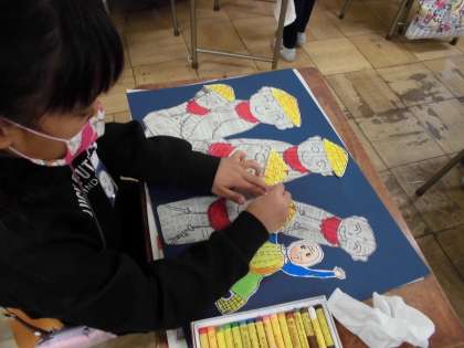 「かさこじぞう」のお話を聞いて、おじいさんが、お地蔵さんにかさをかぶせる場面を絵に描きました。今日は、かの絵を描いてお地蔵さんにかぶせました。