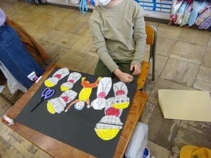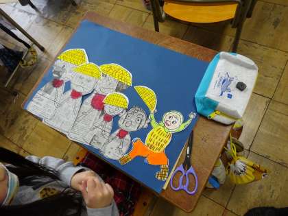 おじぞうさま、おじいさん、かさを並べて台紙に貼りました。いろいろと向きを変えることにより、自分の思いを表現した絵になりますね。