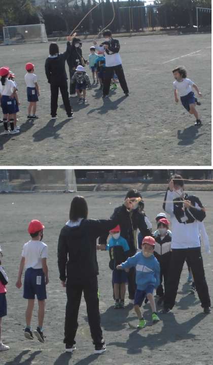 長なわ跳びが跳べるように、なわに入るタイミングをつかむ練習しています。