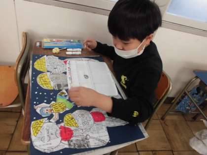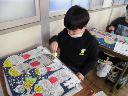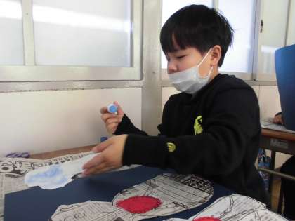 交流クラスの図工で、かさこ地蔵の絵を描きました。綿棒やスポンジを使って絵の具をぬり、すてきな作品に仕上がりました。