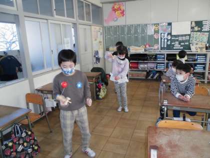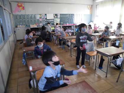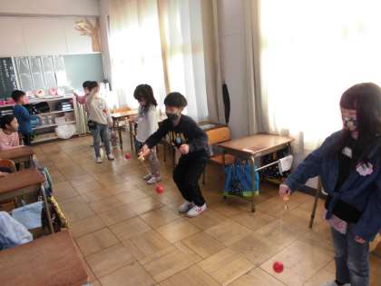 道徳「にほんのあそび」で、遊んだことがあるものや知っている昔あそびを発表したり、どうやって遊ぶのか知ったりしました。そのあと、お手玉やけん玉、カルタを使って遊びました。「とても楽しかった。」「また、やりたい。」と、喜んでいました。