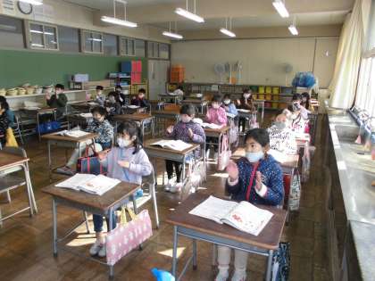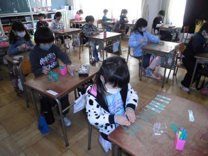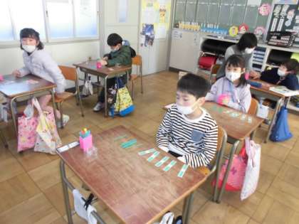 学習の様子【1月14日(金)の1年生】 公開日 2022/01/15 更新日 2022/01/15 1年 音楽の時間、「フルーツケーキ」の曲に合わせ、フルーツの名まえを口ずさみながら、手拍子をしました。算数では、大きな数を10の束とばらの数え棒を並べたり、数字でかきあらわしたりしました。