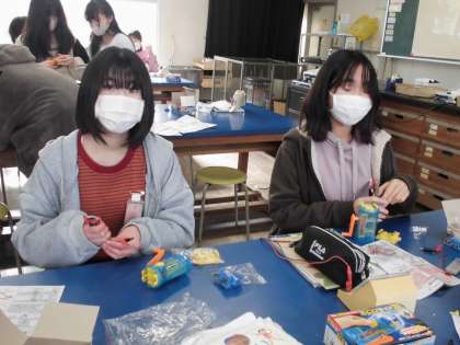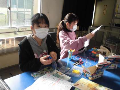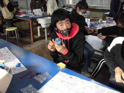 理科の授業で、発電した電気を光や音に変換する実験をしました。