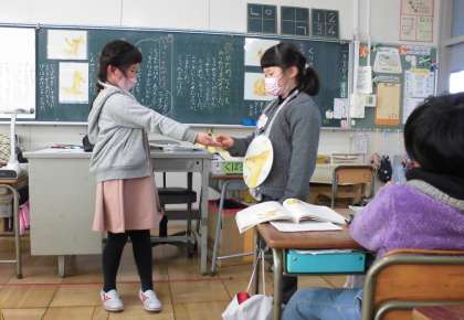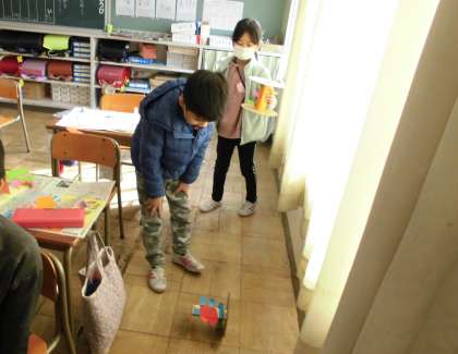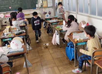 図工と道徳【1月20日(木)の1年生】 公開日 2022/01/21 更新日 2022/01/21 1年 図工の「かみざらころころ」では、転がして面白くなるように、試しながら作っていました。もっと作り続けたい気持ちでいっぱいでした。来週が楽しみですね。 道徳は、「くりのみ」で、キツネやウサギの役割演技をして、それぞれの気持ちを考えました。