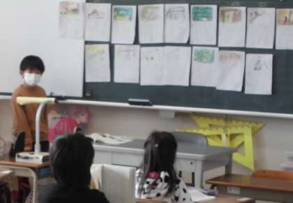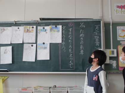 「たぬきの糸車」の好きなところの文を書き写し、文に合うように絵を描きました。最後に、一人ずつ好きなところの文をみんなの前で読みました。好きな文を覚えて、すらすら言える子もいました。