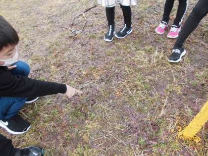 冬見つけ【1月24日(月)の1年生】 公開日 2022/01/24 更新日 2022/01/24 1年 桜やハナミズキの枝先のふくらみや地面に広がったたんぽぽの葉っぱなどを見つけました。また、外では、息が真っ白になり、温かい部屋では白く見えないことにも気づきました。