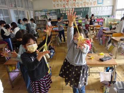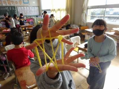 あやとりあそび(図工)【1月25日(火)の2年生】 公開日 2022/01/25 更新日 2022/01/25 2年 「あやとりあそび」の紙版画に取り組みます。実際にあやとりあそびをして、その楽しさを体感しました!