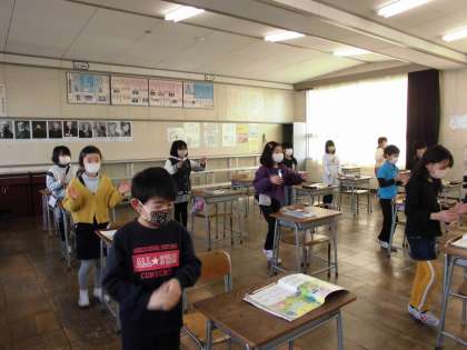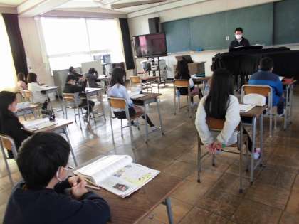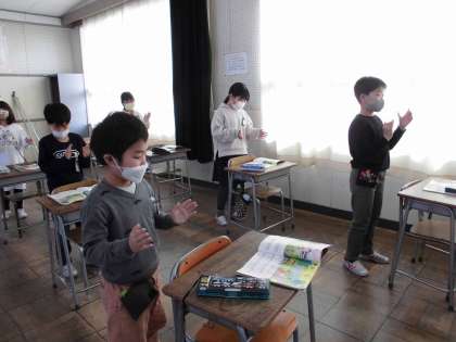 音楽の授業です。みんな、楽しそうに、リズム打ちをしながら、歌を歌っています。
