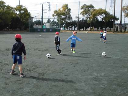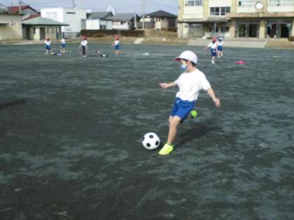 音楽の時間、「フルーツケーキ」の果物の名前を変えて、一人ずつ歌ったり、手をたたいたりしました。体育では、ボールをけったり、ドリブルしたり、なわとびを跳んだりしました。