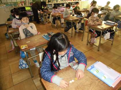 学習の様子 その2【1月25日(火)の1年生】 公開日 2022/01/26 更新日 2022/01/26 1年 算数の時間は、買い物をするときのお金の出し方を学習しました。1円玉、5円玉、10円玉、50円玉を組み合わせ、いろいろな出し方を考えました。道徳では、「はしのうえのおおかみ」を読み、親切にすると、どんな気持ちになるかを考えました。