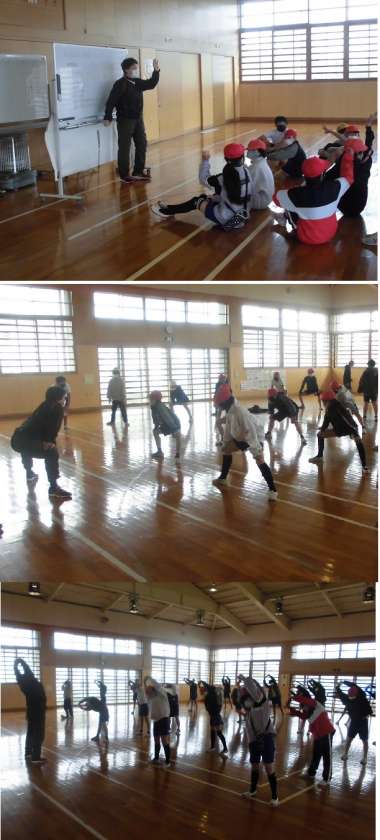 出前授業【3月9日(水)6年生】 公開日 2022/03/09 更新日 2022/03/09 6年 中学校の武道場におじゃまして、中学校の先生の出前授業(体育)を受けました。てきぱきとした集合する練習をしたあと、準備運動を行っています。