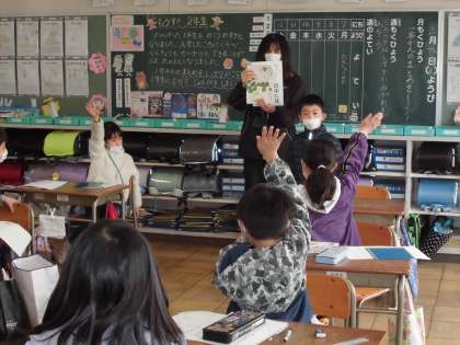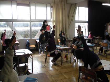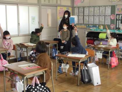 ことば見つけよう 【3月9日(水)の1年生】 公開日 2022/03/09 更新日 2022/03/09 1年 「『ふくろう』の中には何ががありますか。」「『ふくろ』です。一人一人が自分で考えた言葉を問題に出し、クラスみんなで考えました。