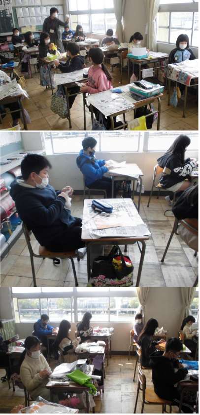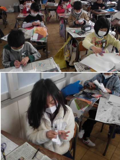 うまれ かわった なかまたち【3月10日(木)3年生】 公開日 2022/03/10 更新日 2022/03/10 3年 手袋を材料にして、頭や体の形に変化させ、いろいろな生き物をつくろうとしています。