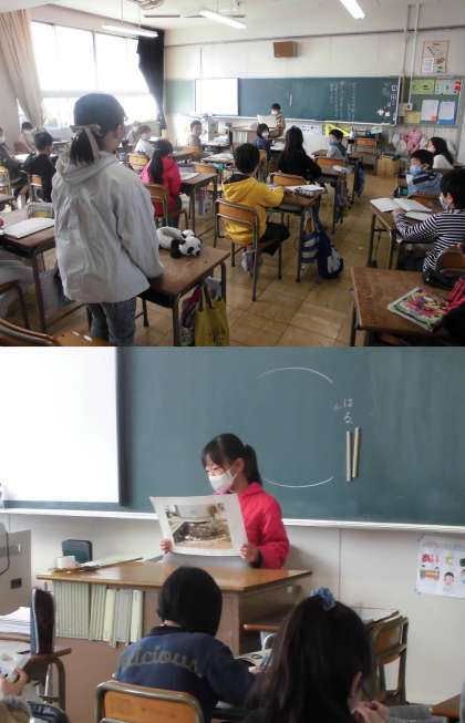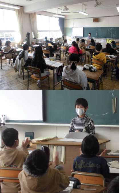 これまでに準備した写真や資料・イラストを使って、学校の自慢や自分の自慢を発表しています。また、発表者に対して、質問をしたり、温かい拍手を送ったりしています。
