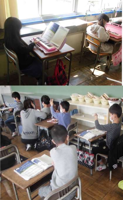 拍に合わせ、リズムに乗ってあいさつをしたあと、「きらきらぼし」の曲をトライアングルと鍵盤ハーモニカの指使いで演奏を楽しんでいます。
