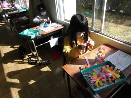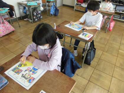 教室の飾りつけの準備【3月14日(()月)の1年生】 公開日 2022/03/14 更新日 2022/03/14 1年 新1年生のために、教室の飾りを作っています。新1年生に教えたいことや知らせたいこと絵や文でかき、色を丁寧に塗りました。細長く切った色紙を使って花や環飾りを作りました。