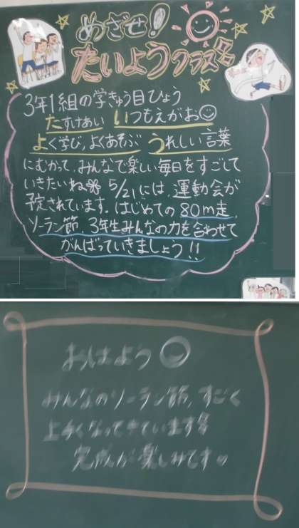 担任の先生より【5月10日(火)3年生】 公開日 2022/05/10 更新日 2022/05/10 3年 体育でがんばっているリズムダンス(ソーラン節)、みんなの成長ぶりをうれしく思っています。これから、もっとよくしていきましょう。お家の人も楽しみにしてみえると思います。がんばって練習に励みましょう。