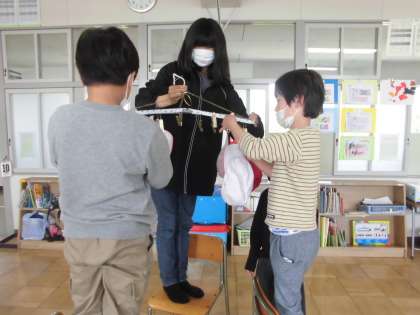 生活単元で、洗濯の仕方を勉強しました。みんなで協力して、洗濯物を干すことができました。