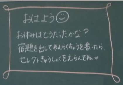 お休みのあと、また今日からがんばりましょう。セレクト給食の希望をとっています。楽しみですね。
