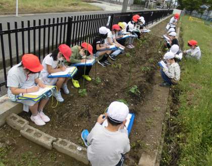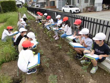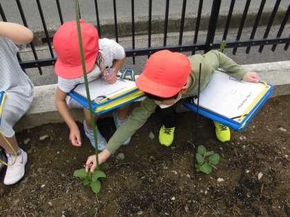 生活科の授業で、畑に植えた野菜の苗を観察しました。