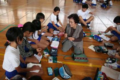 児童たちは、家庭科の授業で習った「玉どめ・玉結び・なみ縫い」を生かし、持参したタオルをぞうきんにしていました。