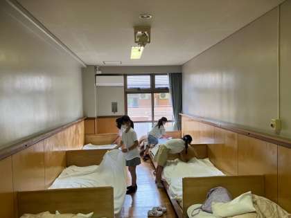 野外教育活動 入室【9月9日(金)の5年生】 公開日 2022/09/09 更新日 2022/09/09 5年 いよいよ部屋に入ります。部屋のベットのマットレスは東京オリンピックの選手村で使われたもののようです。世界のトップアスリートと同じマットで寝られるということで嬉しくなります。さっそくシーツをつけて、ベッドメイキングをします。