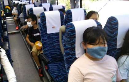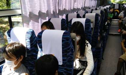 バスの中の様子です。今のところ学校到着時間は12時(今後の道路事情により変更もありますので、ご容赦願います)、解散式は体育館で行います。解散は12時15分の予定です。よろしくお願いします。