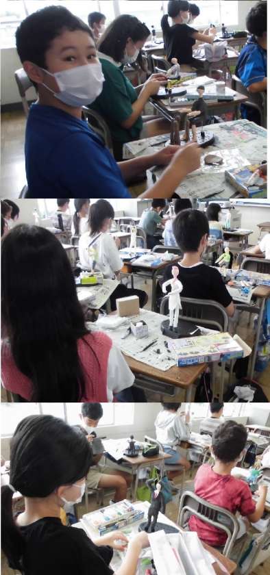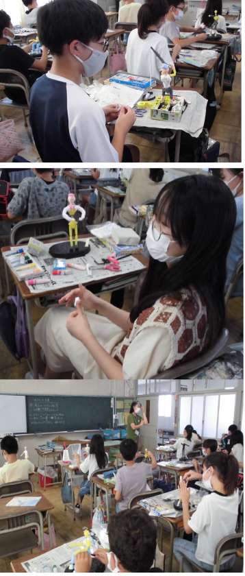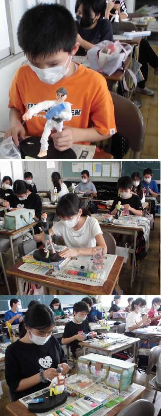 未来の自分の姿でポーズや服装などを想像し、芯に粘土で肉付けをしています。写真の上部3枚は、前回の様子です。どんどん完成に近づいてきています。