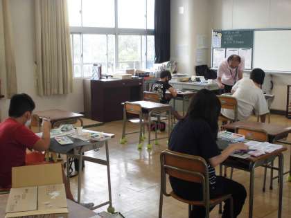 先の部分に絵の具をつけた綿棒で、黒い画用紙に花火を表現していました。