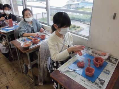 粘土へラを使って、ていねいに模様を書いたり、イニシャルを入れたりして、工夫しています。