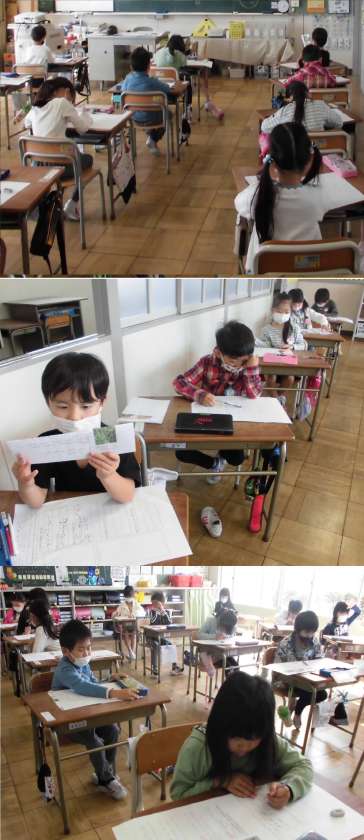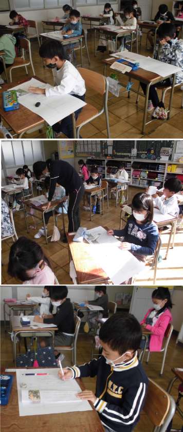 うみのかくれんぼ【10月11日(火)1年生】 公開日 2022/10/11 更新日 2022/10/11 1年 ばった、しゃくとりむし、おうぎがに、くまのみなどの隠れかたをまとめ、友達に知らせようとしています。