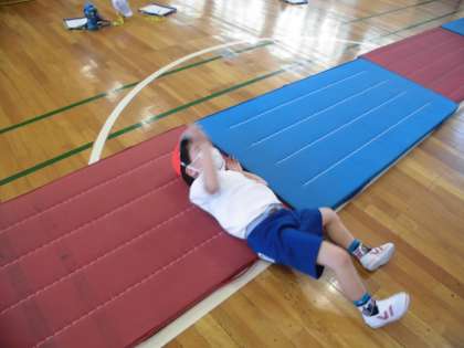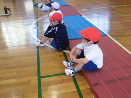 体育のマット運動です。よい姿勢でお話を聞き、横転がりの練習を頑張りました。