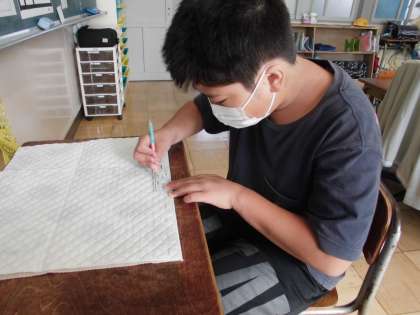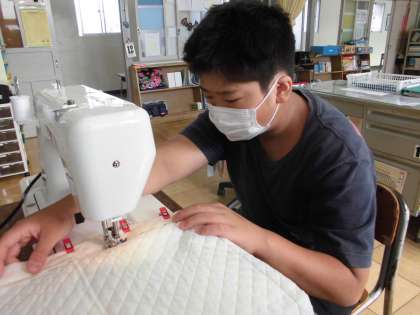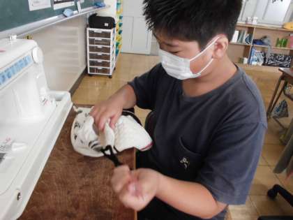 ナップザックを作りました。印付け、ミシン、ひも通しと、どの作業も丁寧に行っていました。あとは、名前シールをアイロンで貼り付けるのみです。頑張ったね!