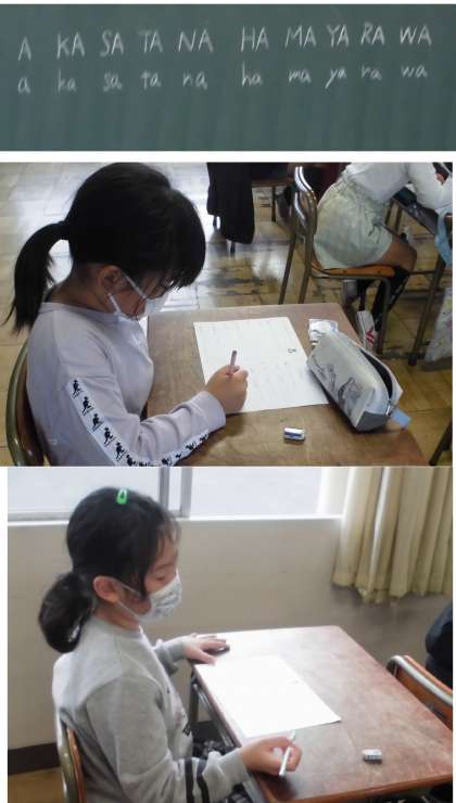 ローマ字の練習をしています。黒板に書かれた字を確認しながら練習しています。